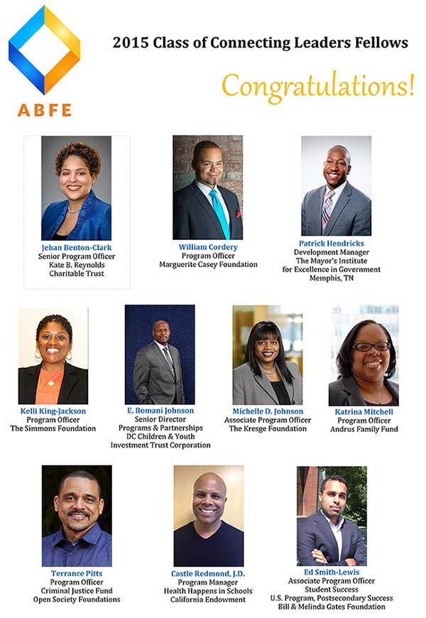 New York, NY (BlackNews.com) — ABFE: A Philanthropic Partnership for Black Communities, formally known as the Association of Black Foundation Executives, is announcing the Class of 2015 – the 9th Class of ABFE Fellows, an exciting group of philanthropic professionals. The six men and four women have vast experience across a range of issue areas including youth development, health, education and advocacy. The class is also geographically diverse, with three members from the South, three from the West, one from the Mid-West and three from the NY-DC corridor.