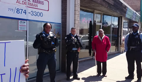 When protesters arrived for the Press Conference in front of the alderman’s ward office at 8539 S. Cottage Grove Ave., there were 6 Police SUV Squad Cars already stationed on the street in various places, and a few police officers standing on the sidewalk with protesters to watch what was going on.