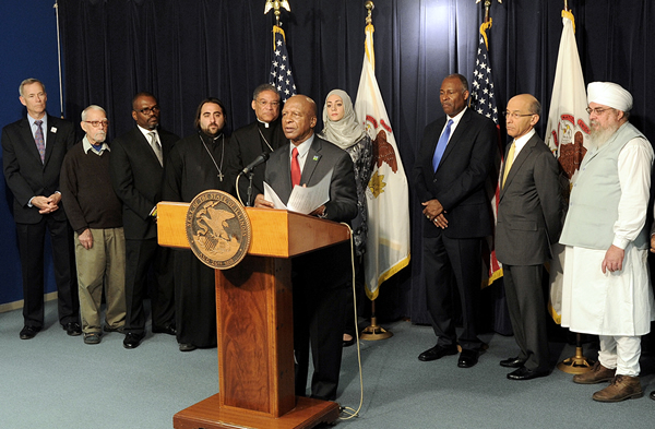 White is at podium, pictured from left to right: Kevin Cmunt, CEO Gift of Hope; Ed Young of SGI USA Buddhist Center; Bishop Lance Davis, of the New Zion Covenant Church in Dolton; Rev. Father Chrysanthos Kerkeres, senior priest at St. George Greek Orthodox Church; the Most Reverend Joseph Perry, Auxiliary Bishop of Chicago, representing Archbishop Blase J. Cupich, Archbishop of Chicago; Reem Hobeldin of the Council of Islamic Organizations of Greater Chicago; Pastor Myron McCoy, senior pastor at First United Methodist Church at the Chicago Temple; Rabbi Michael R. Zedek of Emanuel Congregation of Chicago, a senior rabbi, scholar, teacher and civic activist; S.S. Shiva Singh Khalsa, a Minister of Sikh Dharma International and President of the Spirit Rising Foundation.